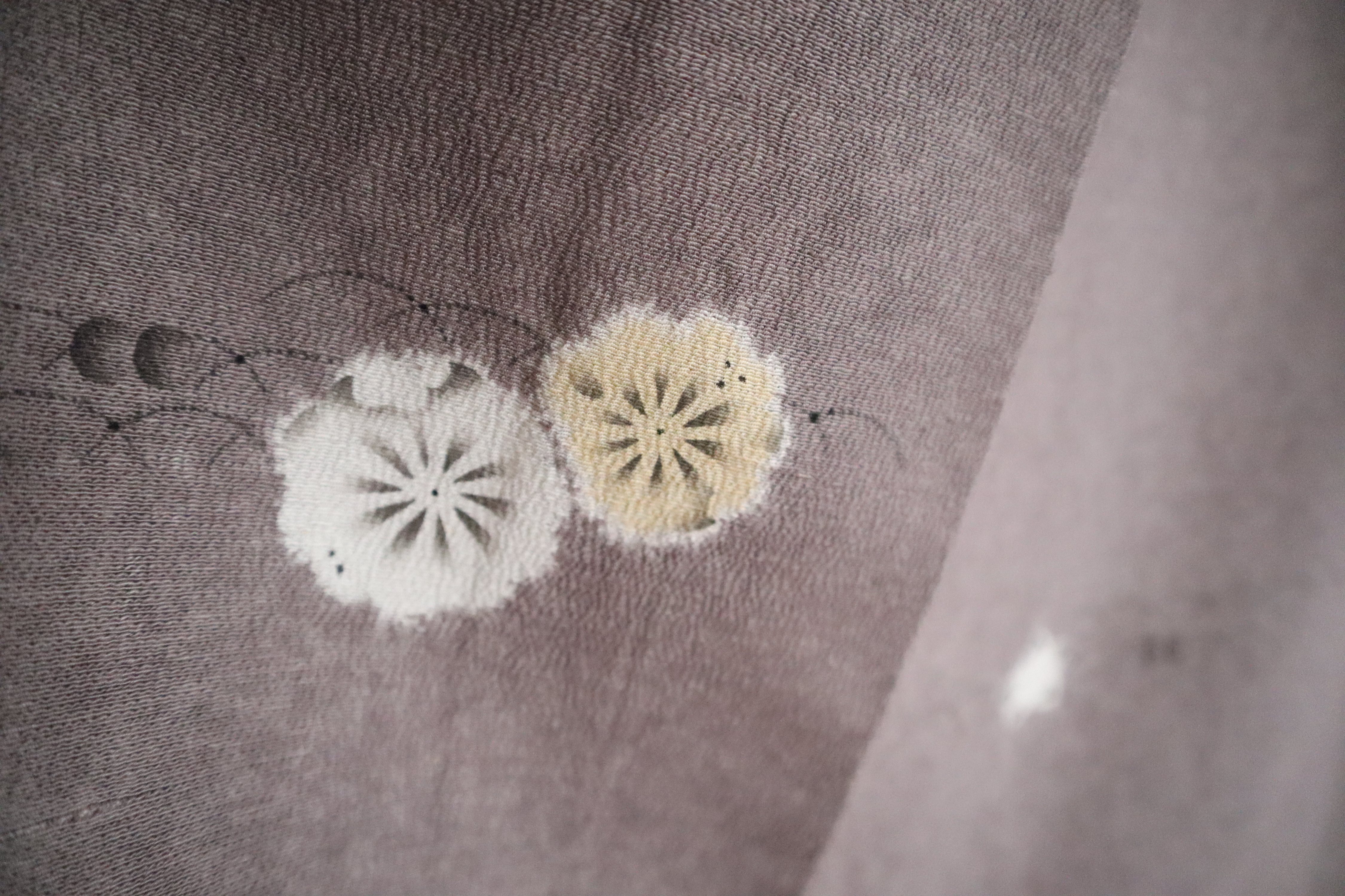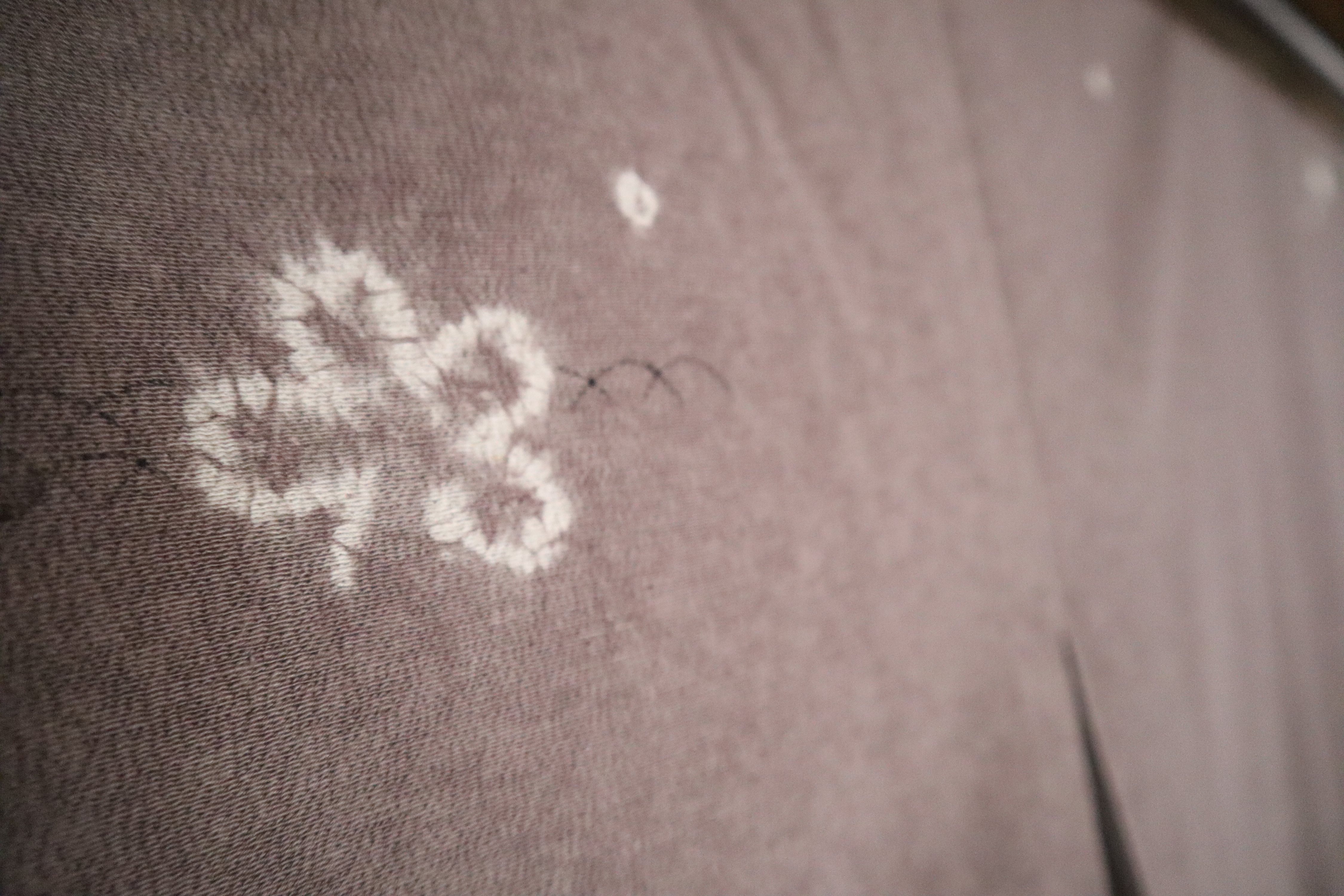 地色は今年のPANTONEの色、モカムースを意識して染め、辻が花では定番の菊、藤、桜、桔梗などを絞りました。